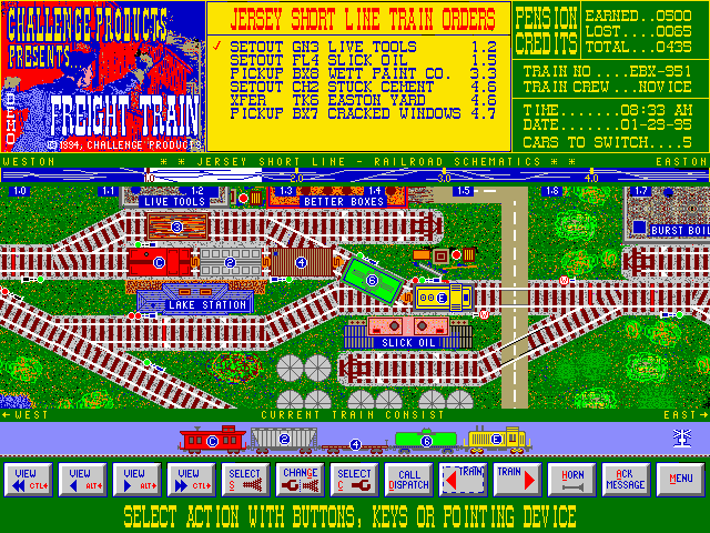 FREIGHT TRAIN is a railroad oriented PC game. It is based on moving a way-freight train from one terminal to another, switching freight cars along the route. The train is viewed from a top or plan view but the screen also includes a side view of the train consist. Cars are coupled and uncoupled, track switches are aligned, and the engine with train is moved along the track, all with use of keyboard keys or mouse cursor and buttons.