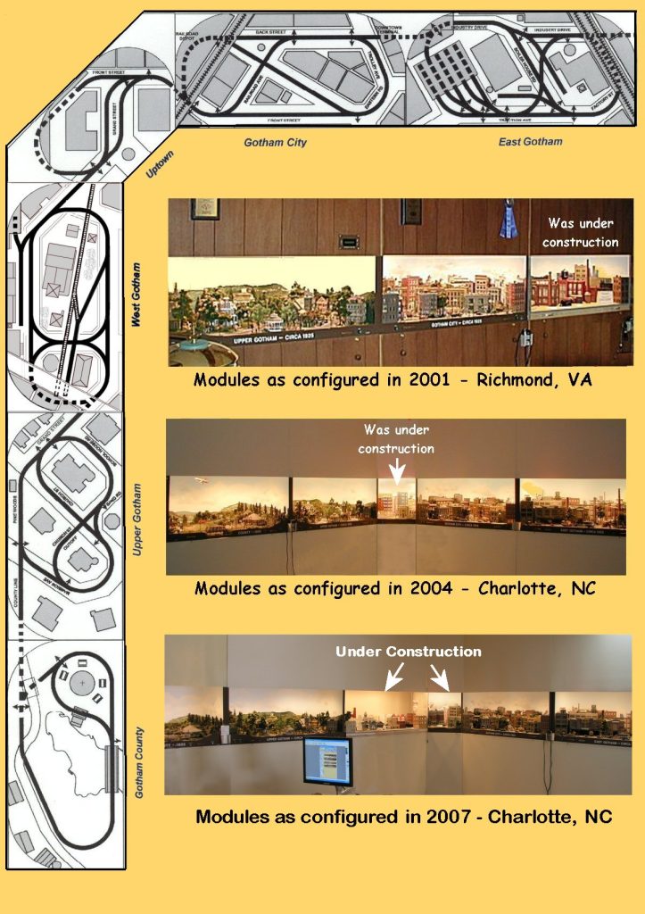 The thinking behind the Town & Country Traction Company began in the early 1990’s when various modular approaches to HO trolley modeling were tried. In 1994, construction of the T&CT Co. Gotham City module began in earnest. Although six modules, or dioramas, were planned, only four were fully developed. These modules include: Gotham City – completed 1996; Upper Gotham – completed 1998; East Gotham – completed 2000; Gotham County – completed in 2003; Uptown Gotham and West Gotham were abandoned when the four built modules were donated to the Charlotte Trolley Museum.